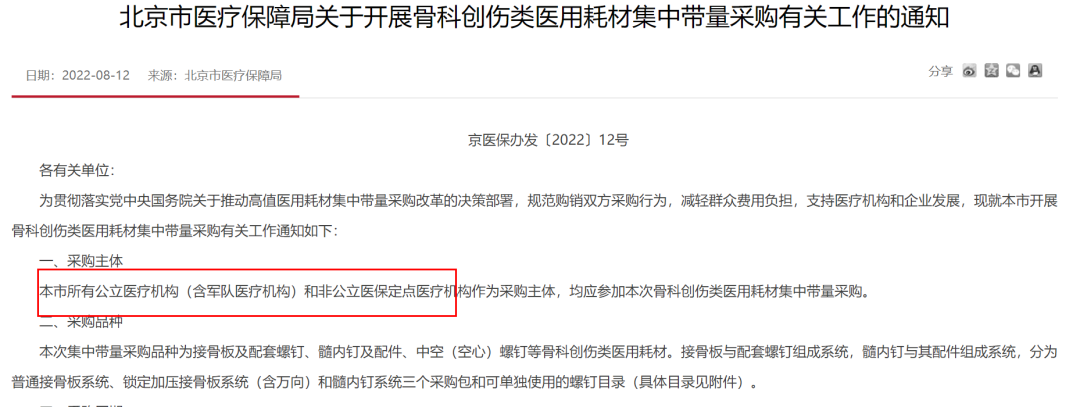 就在同一天(8月12日),北京市醫(yī)保局發(fā)布了《關(guān)于開展骨科創(chuàng)傷類醫(yī)用耗材集中帶量采購有關(guān)工作的通知》,明確本次帶量采購的主體,公立醫(yī)院、非公立醫(yī)保定點醫(yī)療機構(gòu)須全部參加。