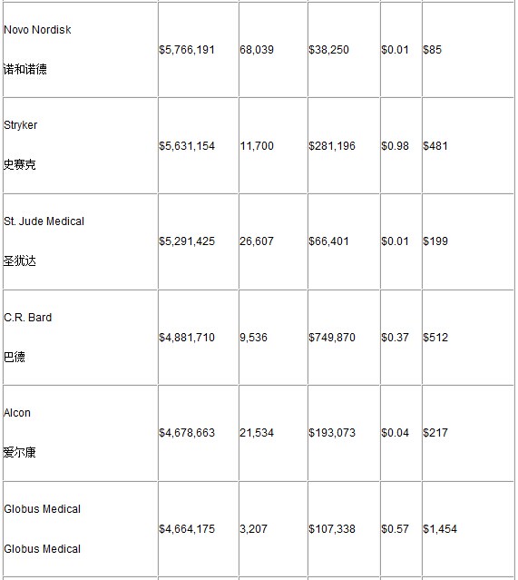 毫不奇怪,強生公司(紐約股票交易所代號:JNJ)及附屬公司是迄今為止付款最大的企業(yè),共付$5260萬美元和超過6萬項付款。強生公司的最高單付款,也是特許權使用費,為$2.1萬美元。該公司的平均支付額為$876美元。