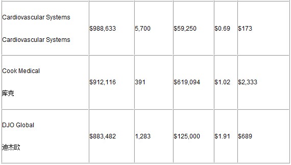 MassDevice.com的分析數據表明,醫(yī)療儀器公司總共付款48.1萬次,支付了$1.99億美元。最高單筆支付為美敦力公司(紐約證券交易所代碼:MDT)的$300萬美元的特許權使用費。一些公司公布付款低至1美分,有的甚至是$0美元。根據數據庫,平均付款為$414美元。
