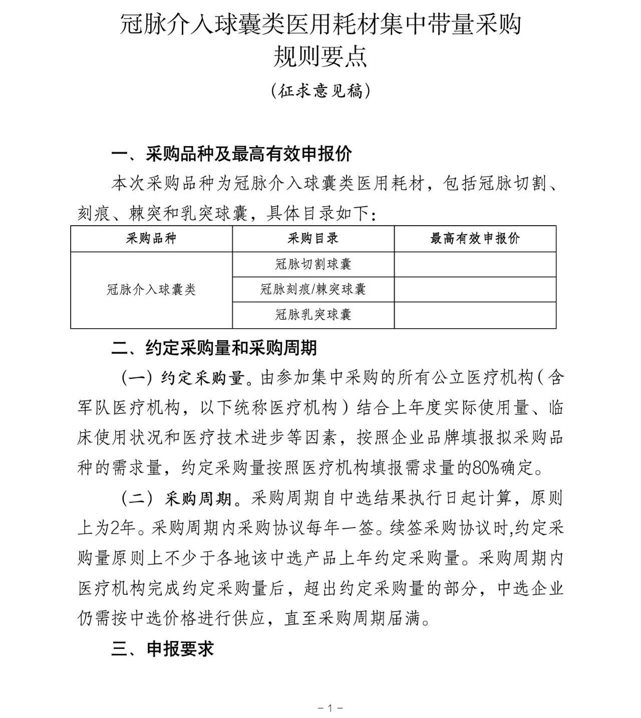 根據(jù)《意見稿》,此次采購品種為冠脈介入球囊類耗材,包括冠脈切割、刻痕、棘突和乳突球囊,最高有效申報(bào)價(jià)暫未公布。