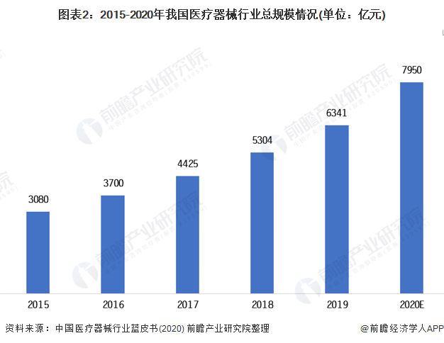 隨著我國醫療器械行業的技術革新及產業鏈成熟,市場容量將會不斷擴大,加之疫情對我國醫療器械行業的巨大推動作用。前瞻預計,2020年我國醫療器械行業市場規模大約為7950億元。