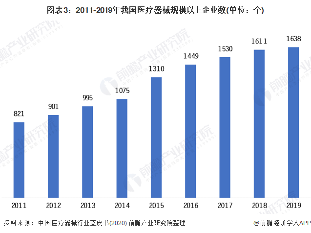 中國醫療器械產業由小到大,迅速發展,現已成為一個產品門類比較齊全、創新能力不斷增強、市場需求十分旺盛的朝陽產業。近年來,國家積極出臺政策,完善醫療器械監管政策,加大醫療政策的監管力度,醫療器械行業在國家“調結構”“轉方式”的指引下,保持了相對穩定的發展速度。2019年我國醫療器械行業企業數為1638個,較2018年增加了27個。