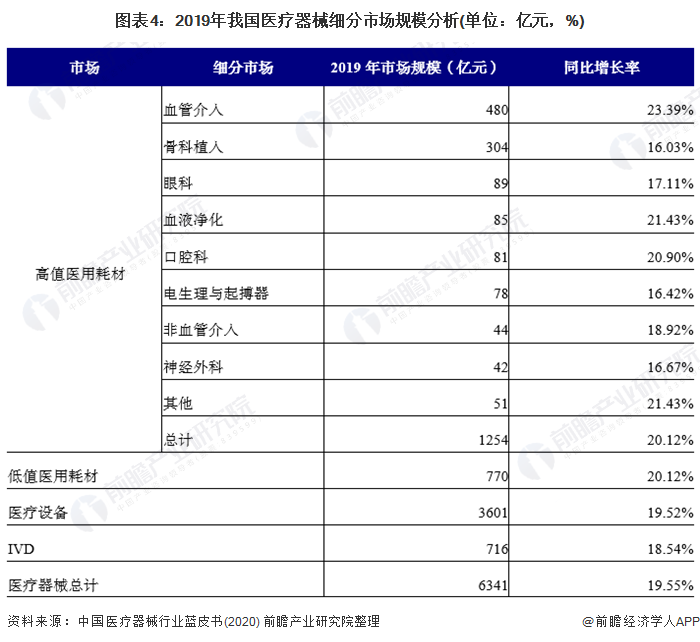 按醫械研究院分法,醫療器械可以分為高值醫用耗材、低值醫用耗材、醫療設備、IVD(體外診斷)四大類。其中根據使用用途不同,又可以將高值醫用耗材市場分為骨科植入、血管介入、神經外科、眼科、口腔科、血液凈化、非血管介入、電生理與起搏器、其他共九小類。