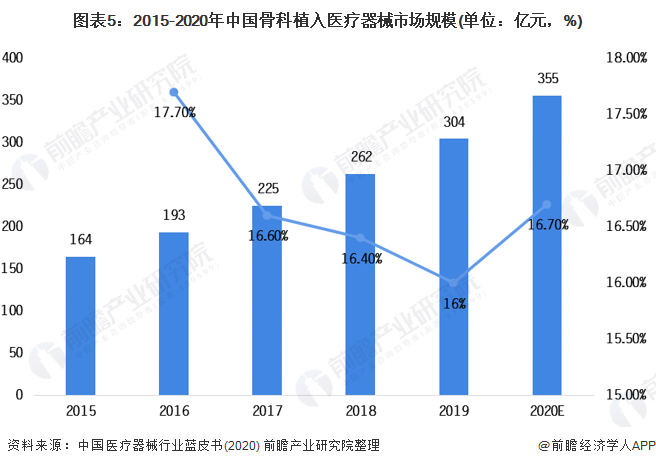 受集中采購、國產“進口替代”等因素影響,近幾年骨科植入市場規模增長逐漸放緩。2019年我骨科植入耗材市場規模約為304億元,同比增長16.03%。前瞻根據近年來中國骨科植入醫療器械市場的發展預測2020年中國骨科植入醫療器械市場規模約為355億元。