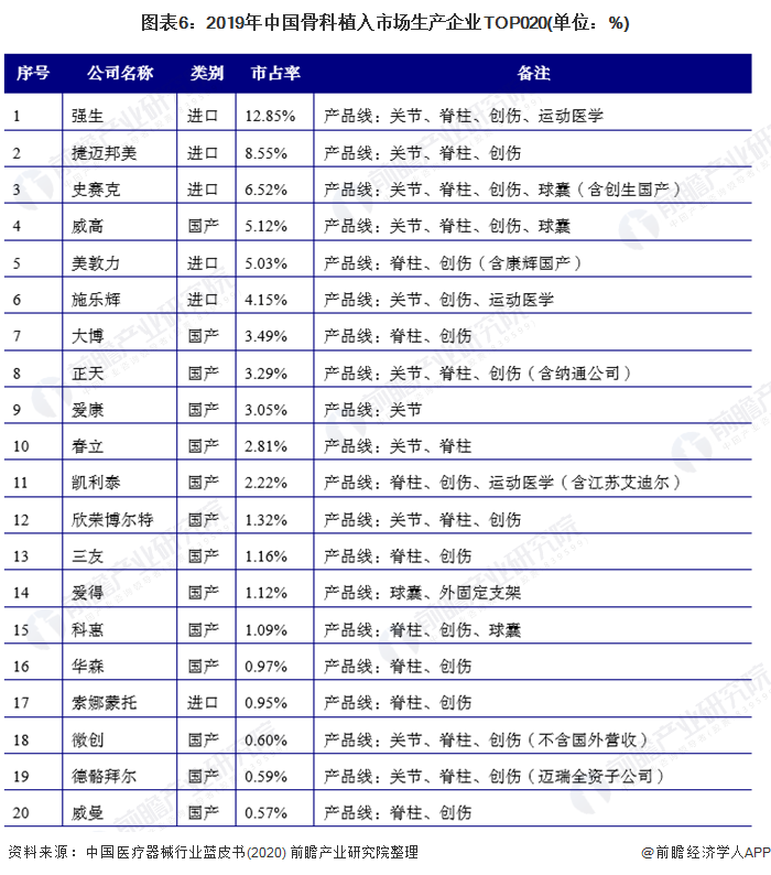 根據中國藥品監督管理研究會在2020年12月發布的《醫療器械藍皮書:中國醫療器械行業發展報告(2020)》指出2019年中國骨科植入市場生產企業TOP020的前三均由海外企業占據;分別是強生(12.85%)、捷邁邦美(8.55%)和史賽克(6.52%)。