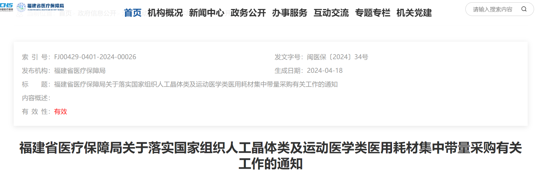 4月19日,福建醫保局發布《關于落實國家組織人工晶體類及運動醫學類醫用耗材集中帶量采購有關工作的通知》,明確將在4月30日起執行人工晶體、運動醫學國采品種的中選結果。