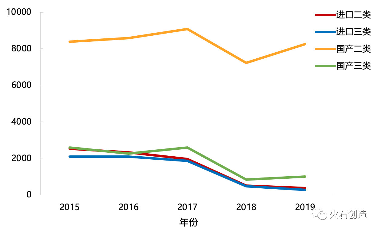 表2 2015—2019年三類器械國(guó)產(chǎn)與進(jìn)口獲批總數(shù)對(duì)比