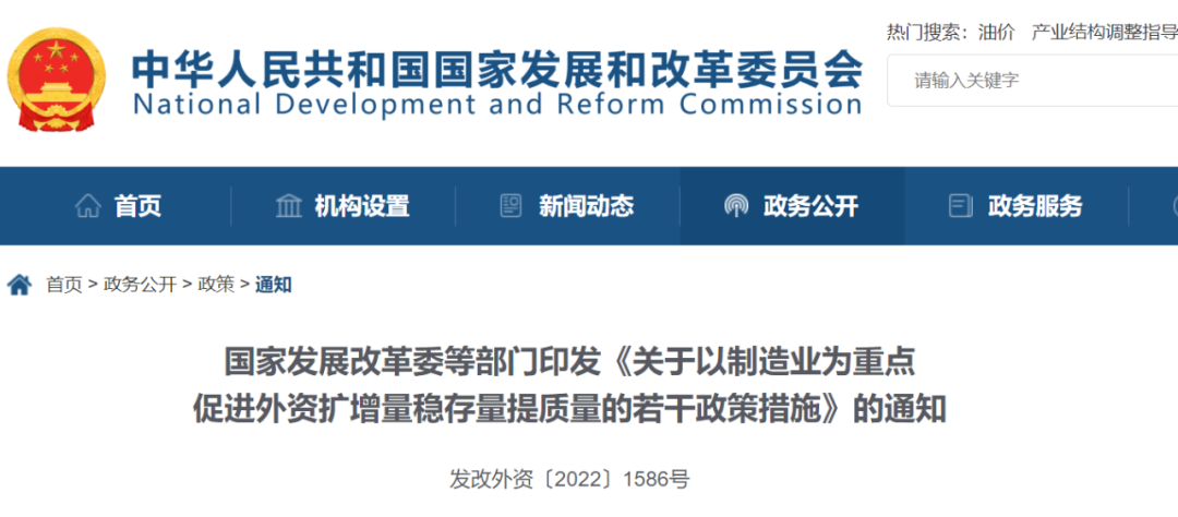 近日,國家發展改革委等六部門聯合發布《關于以制造業為重點促進外資擴增量穩存量提質量的若干政策措施》。