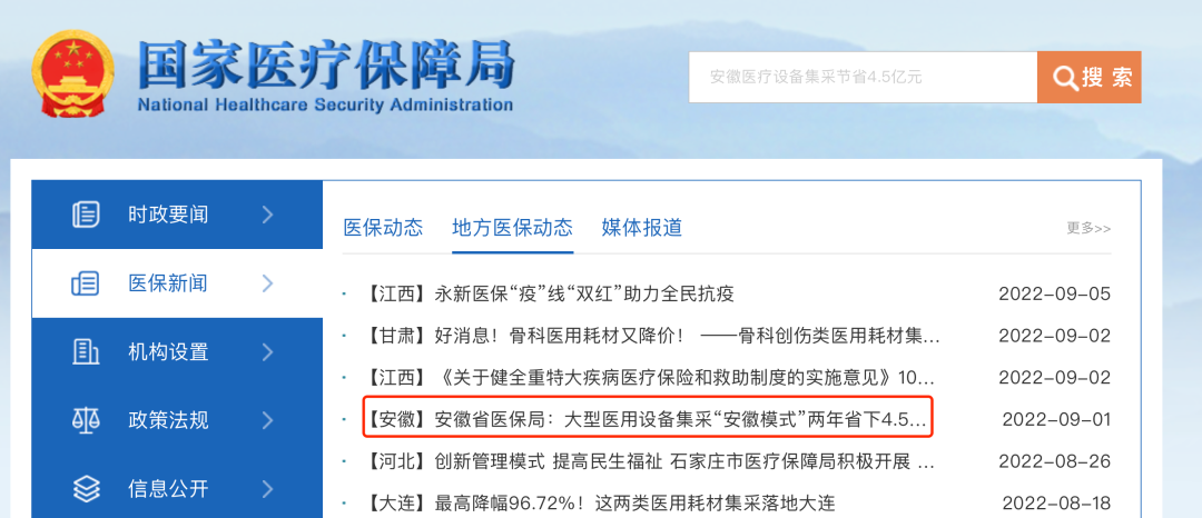 近日,國家醫保局官網轉載人民網文章《安徽省醫保局:大型醫用設備集采“安徽模式”兩年省下4.5億元》,介紹安徽省大型設備集采結果和成效。
