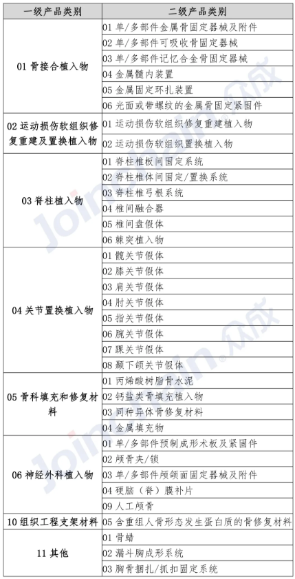按照產品的功能和臨床使用分類,一級類別產品主要有骨接合植入物、運動損傷軟組織修復重建及置換植入物、脊柱植入物、關節置換植入物、骨科填充與修復材料以及少部分神經外科植入物、組織工程支架材料與其他特殊應用材料。