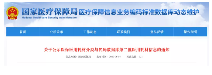 (6月4日),國家醫(yī)保局發(fā)布“關于公示醫(yī)保醫(yī)用耗材分類與代碼數據庫第二批醫(yī)用耗材信息的通知”,內容根據《國家醫(yī)療保障局關于印發(fā)醫(yī)療保障標準化工作指導意見的通知》有關要求,現將第二批醫(yī)用耗材信息予以公示。