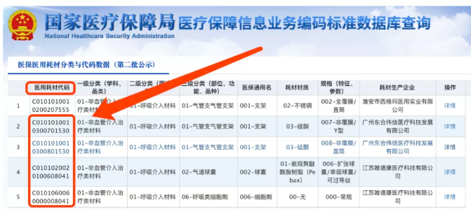 影響全國耗材的編碼,到底長什么樣子,今日公布的數據庫中便可以查詢到,點擊詳情后,還能看到更為具體的信息。