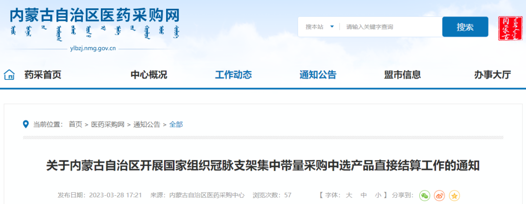 3月28日,內(nèi)蒙古自治區(qū)醫(yī)藥采購(gòu)網(wǎng)發(fā)布《關(guān)于內(nèi)蒙古自治區(qū)開(kāi)展國(guó)家組織冠脈支架集中帶量采購(gòu)中選產(chǎn)品直接結(jié)算工作的通知》(以下簡(jiǎn)稱《通知》)。