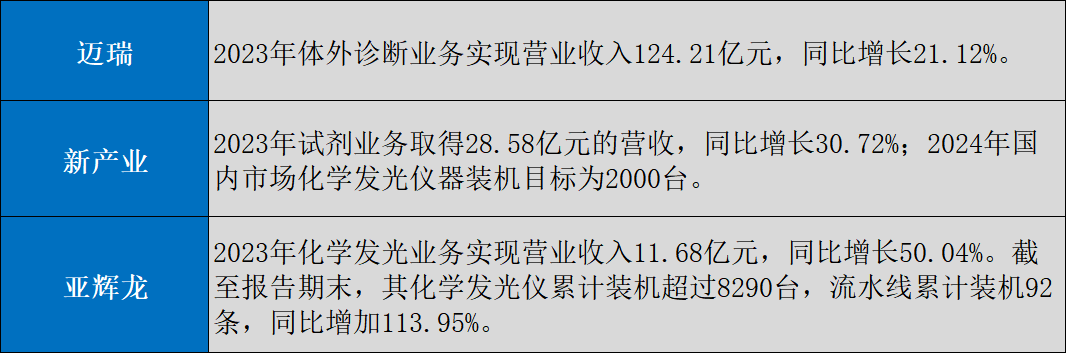 其中,化學發光更是被諸多企業視為“吸金”賽道。邁瑞、新產業、亞輝龍等業內頭部企業均在該領域深入布局,且從近期的公開財報來看,大規模集采落地對國產品牌的紅利效應已經開始在業績上有所體現。