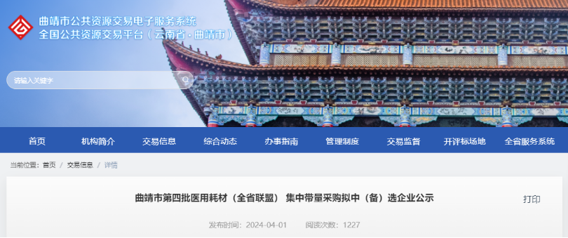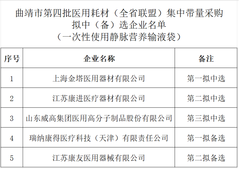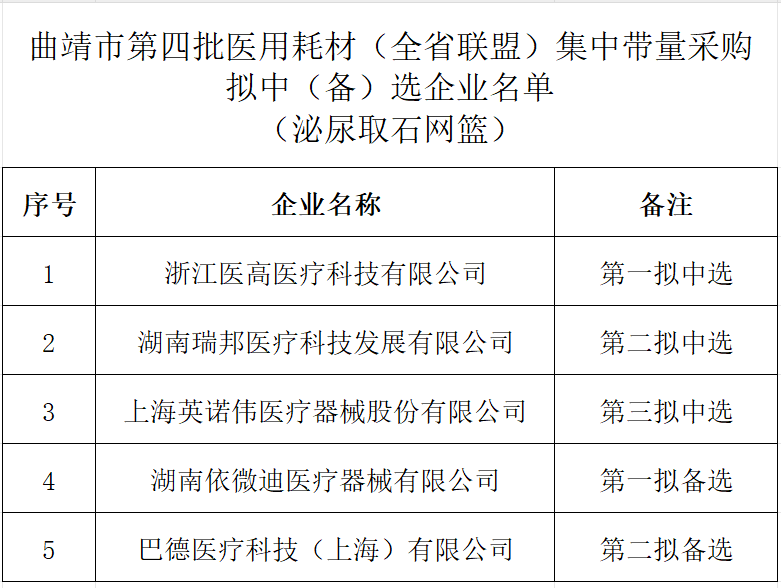 4月1日,云南曲靖市藥品和醫用耗材聯合采購辦公室發布《曲靖市第四批醫用耗材(全省聯盟) 集中帶量采購擬中(備)選企業公示》。