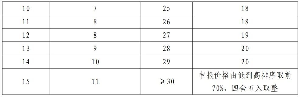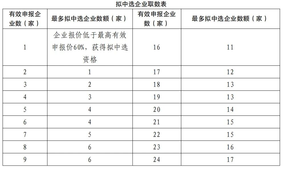 同一競價單元內(nèi),依據(jù)申報企業(yè)報價由低到高進行排名,按照擬中選企業(yè)取數(shù)表(下圖)確定擬中選企業(yè)。