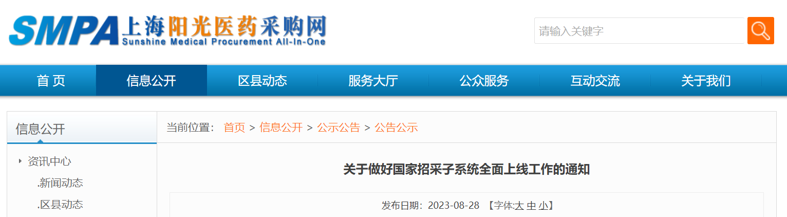 8月28日,上海市陽(yáng)光醫(yī)藥采購(gòu)網(wǎng)發(fā)布了《關(guān)于做好國(guó)家招采子系統(tǒng)全面上線工作的通知》,國(guó)家醫(yī)保信息平臺(tái)藥品和醫(yī)用耗材招采管理子系統(tǒng)(簡(jiǎn)稱“招采子系統(tǒng)”)將于2023年9月11日全面上線應(yīng)用,原陽(yáng)光平臺(tái)采購(gòu)功能停止使用。