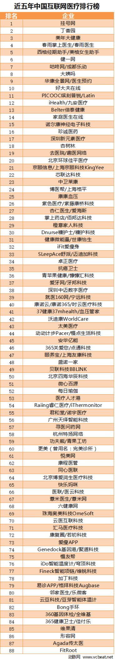 2010-2014五年里有95家企業獲得融資,其中公布融資額的有88家。本榜單中,融資額最高的為專注預約掛號的掛號網/微醫,共計獲得三輪融資,投資機構有騰訊產業共贏基金、晨興創投MorningSide、風和投資、Cybernaut賽伯樂投資,總計2億美元左右的融資額。