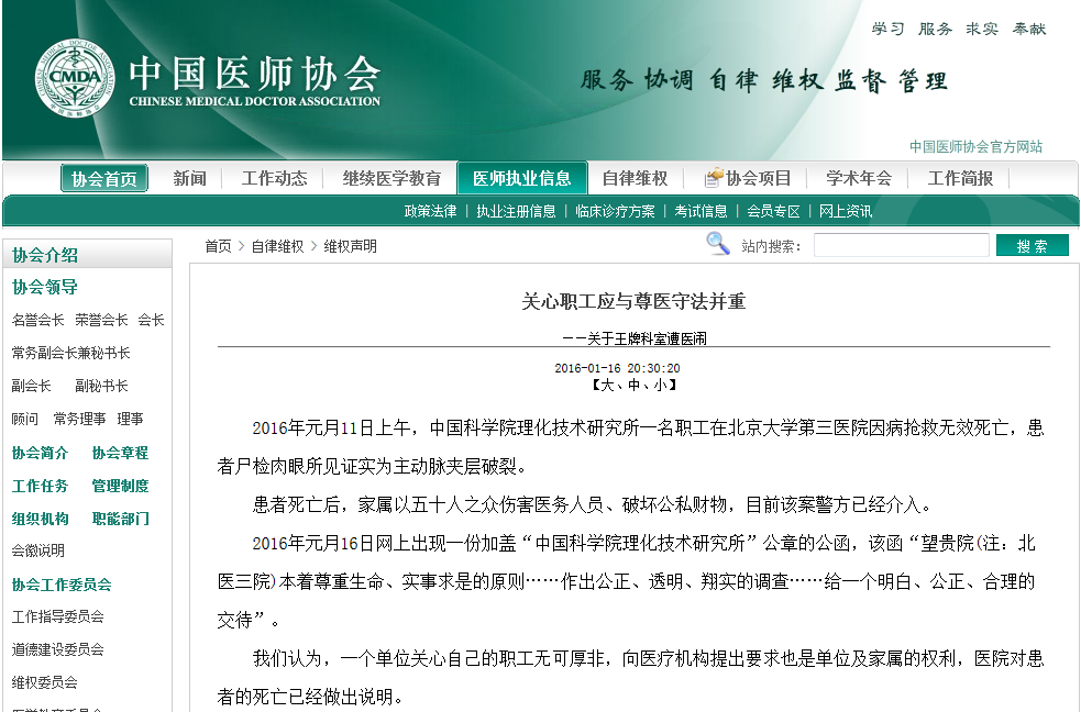 中國醫師協會呼吁:關心職工應與尊醫守法并重 兩家涉事機構發布聲明