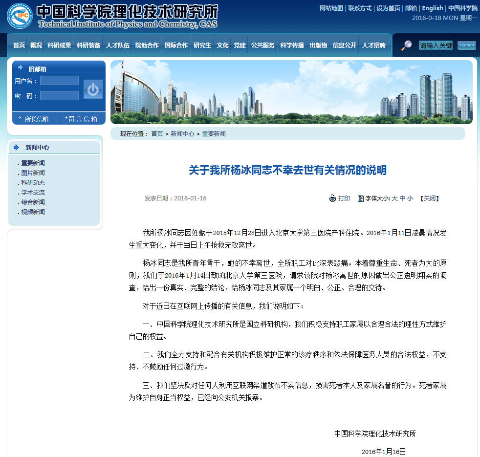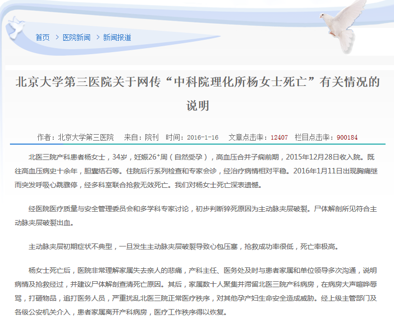 今天 18 時左右,北醫三院發布《北京大學第三醫院關于網傳「中科院理化所楊女士死亡」有關情況的說明》。