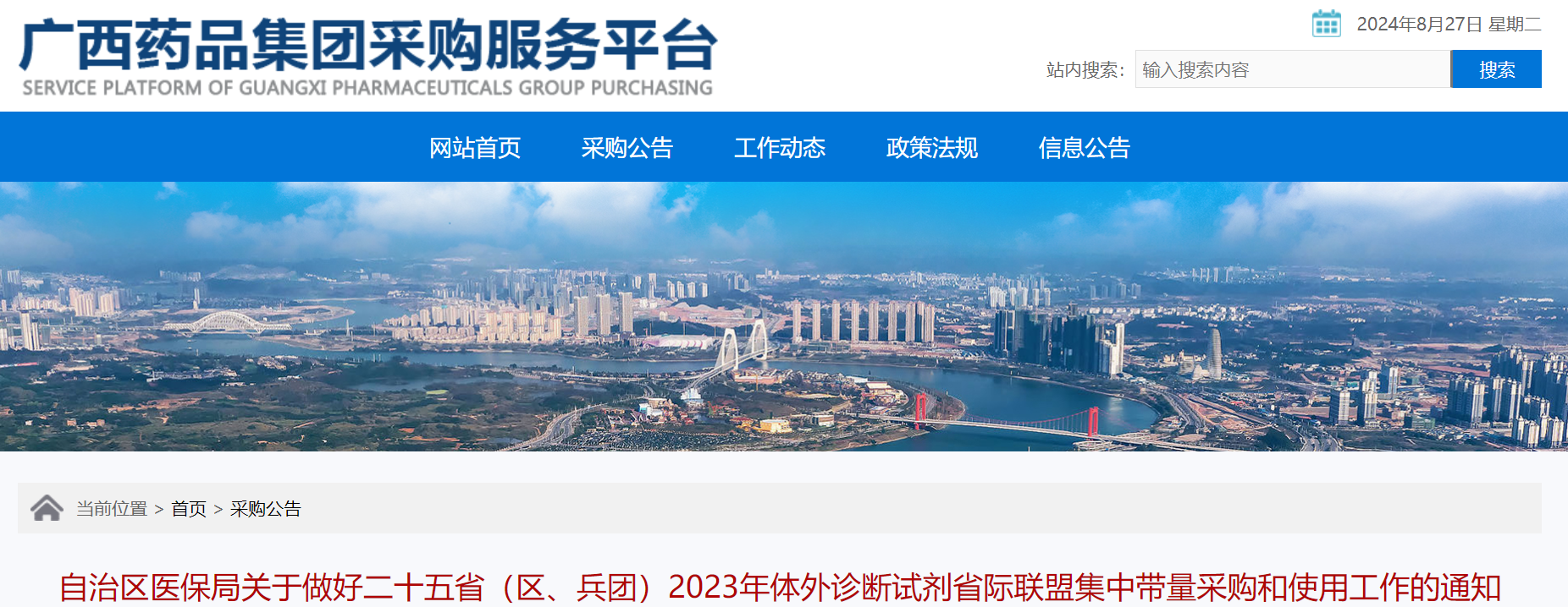 8月26日,廣西壯族自治區醫保局發布《自治區醫保局關于做好二十五省(區、兵團)2023年體外診斷試劑省際聯盟集中帶量采購和使用工作的通知》。