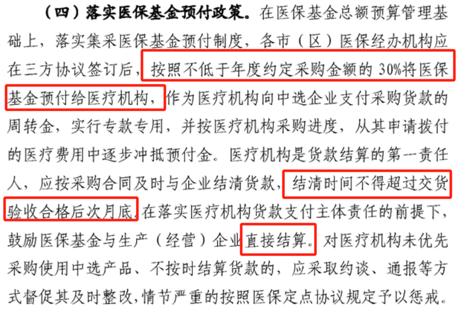 為推動中選結果順利執行,《通知》中明確了一系列相關配套措施,在貨款結算方面要求落實醫保基金預付政策,并鼓勵醫保直接結算,具體如下: