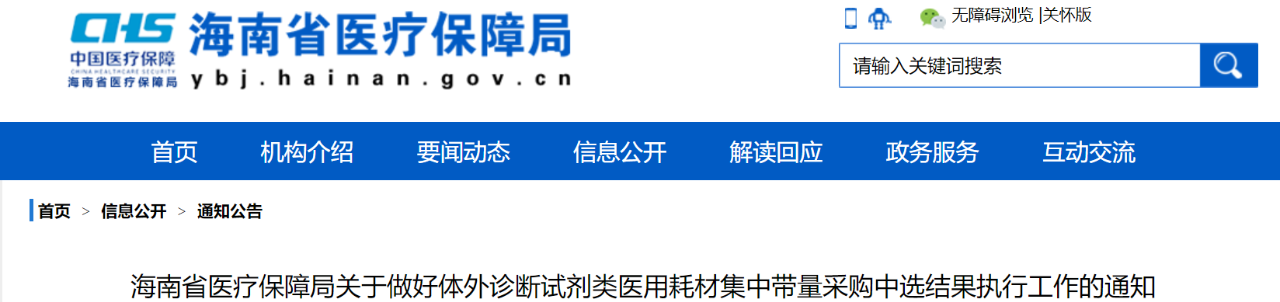 11月26日,海南醫(yī)保局發(fā)布《關(guān)于做好體外診斷試劑類醫(yī)用耗材集中帶量采購(gòu)中選結(jié)果執(zhí)行工作的通知》(簡(jiǎn)稱《通知》)。