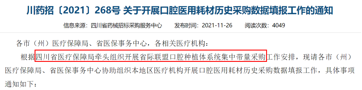 2021年11月17日,四川省藥械招標采購服務中心發布《關于開展部分口腔類高值醫用耗材產品信息采集工作的通知》。