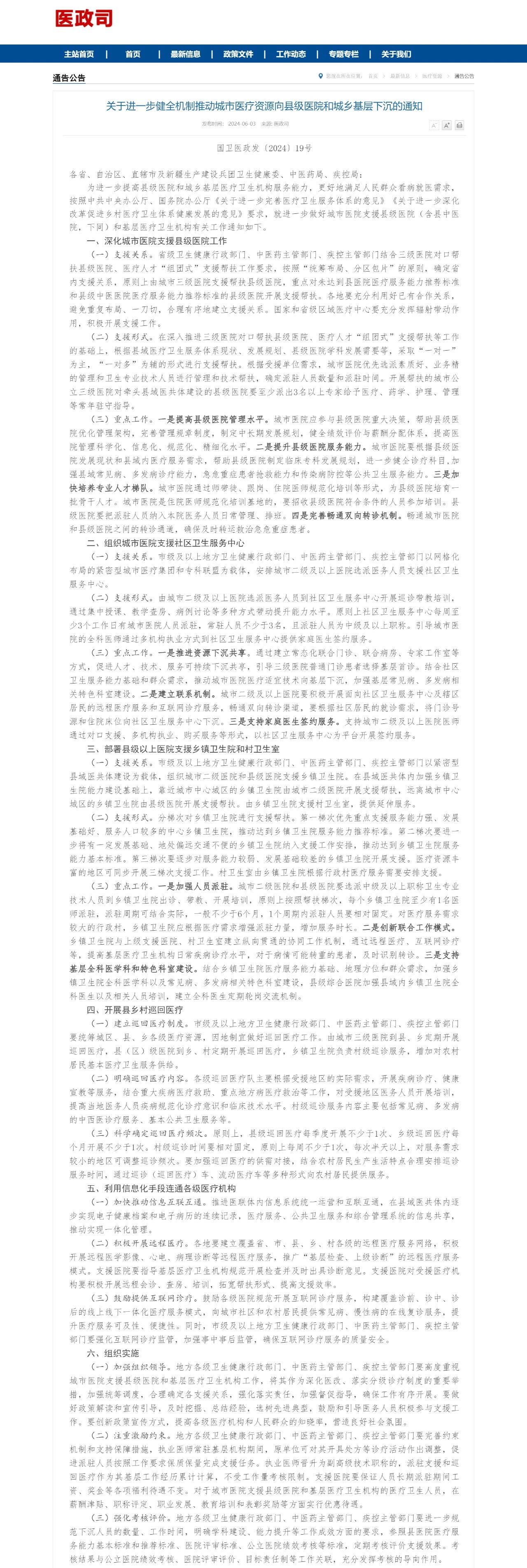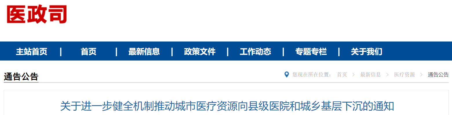 近日,國家衛健委發布《關于進一步健全機制推動城市醫療資源向縣級醫院和城鄉基層下沉的通知》(完整附文末)。