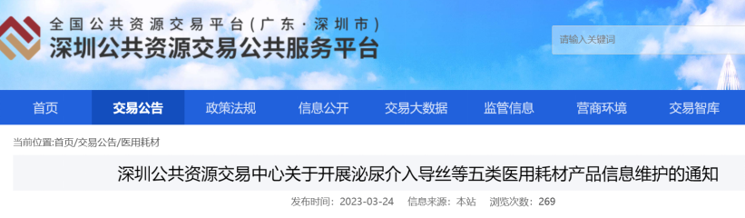 近日,深圳市公共資源交易中心發布《關于開展泌尿介入導絲等五類醫用耗材產品信息維護的通知》,開展泌尿介入導絲、泌尿取石網籃、泌尿介入鞘、泌尿介入封堵器、輸尿管成像導管等五類醫用耗材信息維護。