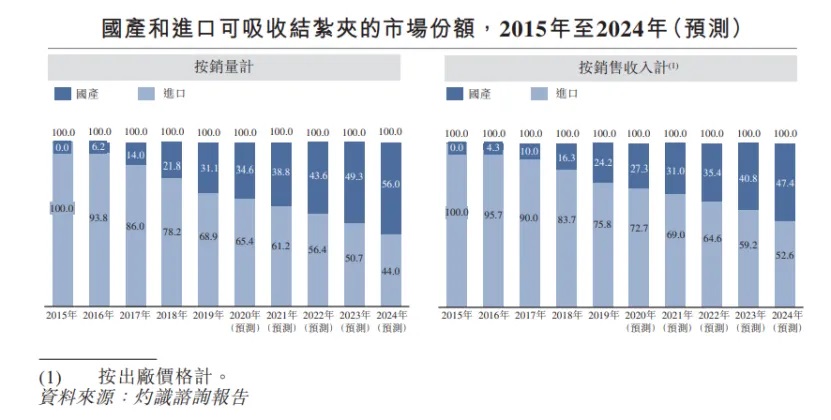 據灼識咨詢報告,預計到2024年中國結扎夾市場規模將達到40.86億元,其中高分子結扎夾市場規模28.33億元,2020-2024年復合增長率達25.2%,可吸收結扎夾市場規模12.53億元,2020-2024年復合增長率達29.2%