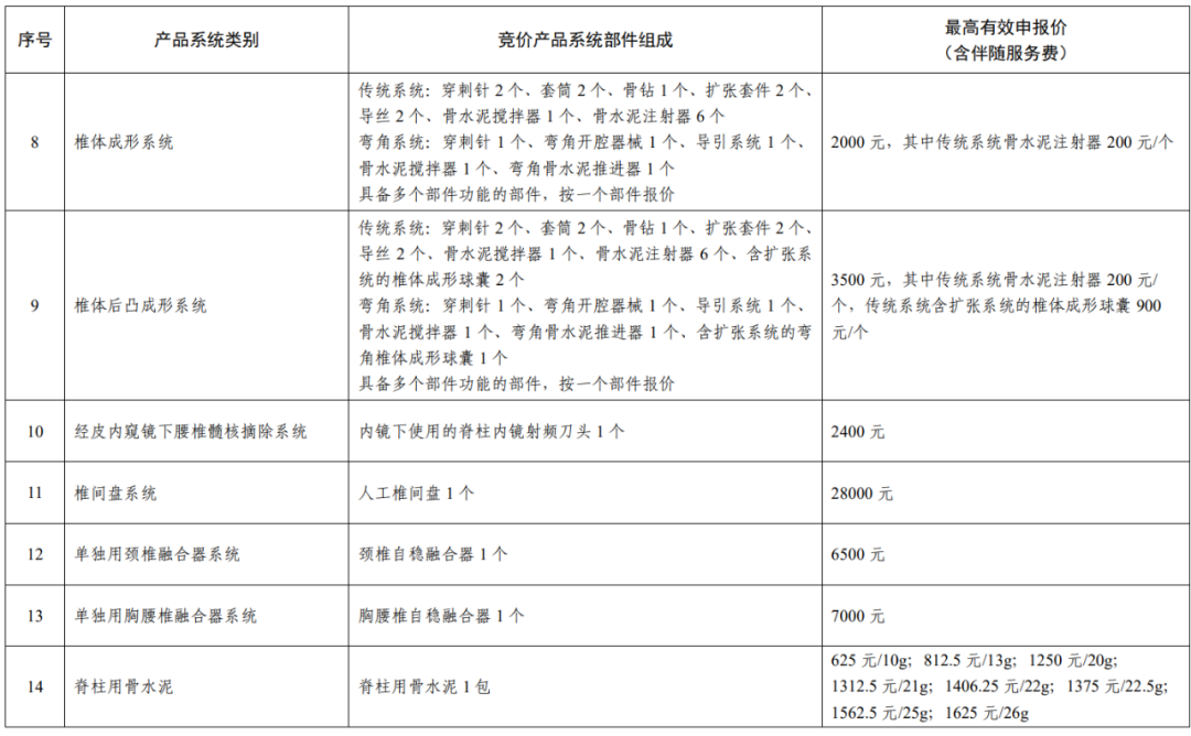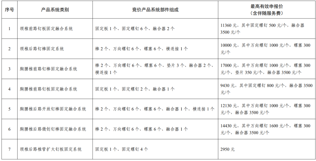 本次集采中,各產品系統類別主要部件按如下規則組成競價產品系統,對應最高有效申報價(含伴隨服務費,骨水泥除外)如下: