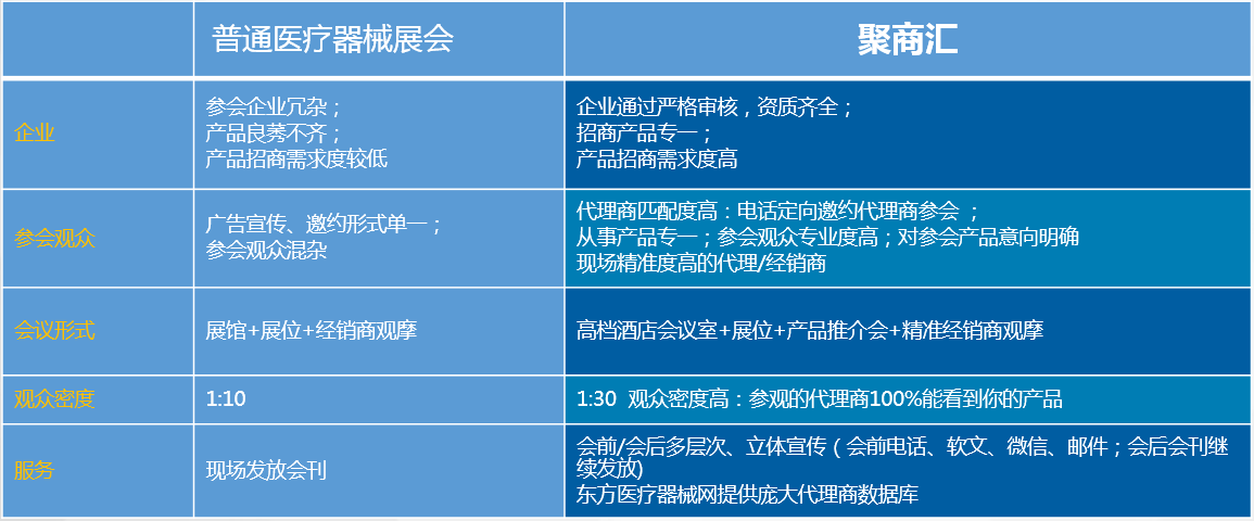 聚商匯是由東方醫(yī)療器械網(wǎng)(www.qxw18.com)運營的線下招商平臺,該平臺立足于為國內(nèi)醫(yī)械全行業(yè)生產(chǎn)/經(jīng)銷型企業(yè)產(chǎn)品招商,以及專業(yè)領(lǐng)域的品牌推介需求提供精準(zhǔn)服務(wù)。