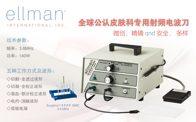 美國愛爾曼國際有限公司(Ellman International, Inc.)總部位于美國紐約市,是一家專門生產高頻射頻電波刀和相關附屬產品的專業公司。其產品代表著當前最先進的射頻電波手術技術,產品銷往世界各地,被世界著名醫療機構廣泛采用。