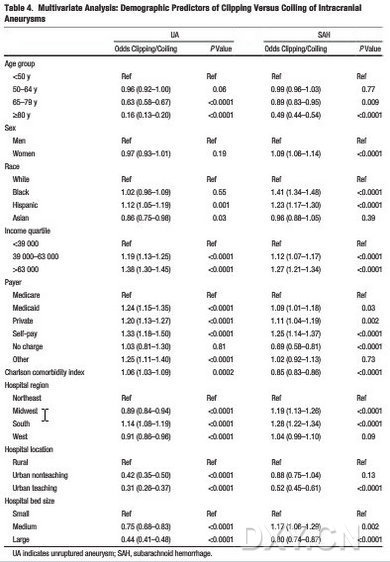 研究結(jié)果表明:當(dāng)對比進行SAH治療的患者時發(fā)現(xiàn),進行未破裂顱內(nèi)動脈瘤治療者女性居多(75.0% 對比69.0%; P<0.0001)??偟?,9.7%接受SAH治療的是自費患者,而3%進行未破裂動脈瘤治療的是自費患者(P<0.0001);62.2%接受SAH治療的是白種人,而76.4%進行未破裂顱內(nèi)動脈瘤治療的是白種人(P<0.0001);黑人、拉美裔和亞洲患者在接受SAH治療組中所占比例較高,相對而言,在未破裂顱內(nèi)動脈瘤治療組中所占比例較低(他們的P<0.0001)