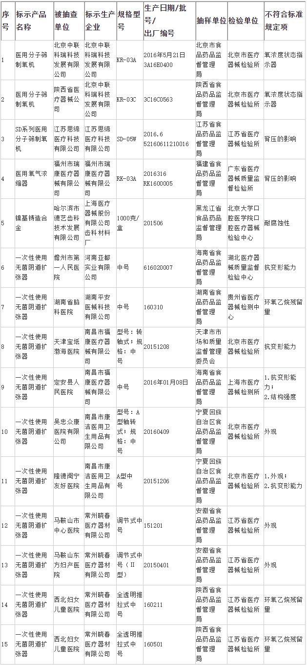 為加強醫療器械質量監督管理,保障醫療器械產品使用安全有效,國家食品藥品監督管理總局組織對醫用氧氣濃縮器(醫用制氧機)、牙科非貴金屬鑄造合金(含烤瓷合金)等3個品種155批(臺)的產品進行了質量監督抽檢。現將抽檢結果公告如下: