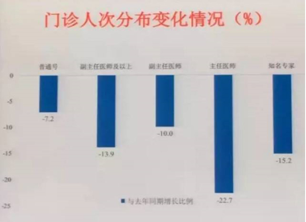 在三級醫(yī)院里,不同職級醫(yī)生的接診量也發(fā)生了變化。總體來看,改革后,副主任醫(yī)師門診人次下降了10%,主任醫(yī)師下降了22.7%,知名專家的門診人次下降了15.2%。“可以看到,大家在就診的時候更加理性,不盲目追求專家號。這也緩解了真正需要專家號的患者掛號難的問題,使得我們的專家資源更能夠用于那些疑難重癥的處置上,而不是我們的專家去看普通病、常見病。”