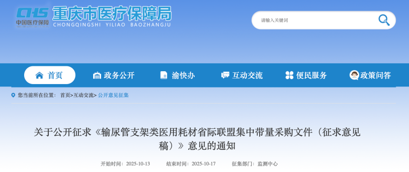 10月13日,重慶醫保局發布《關于公開征求<輸尿管支架類醫用耗材省際聯盟集中帶量采購文件(征求意見稿)>意見的通知》(以下簡稱《征求意見稿》)。