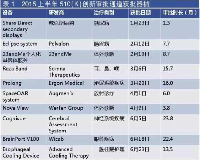 低風險的器械通常是通過510(k)通道審批,是另一條更快捷的新型醫療器械審批通道(de novo clearance),開放給而那些與以往的技術差別很大的設備。2015上半年通過創新醫療器械審批程序的器械有10個,僅略低于以往年平均值。