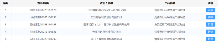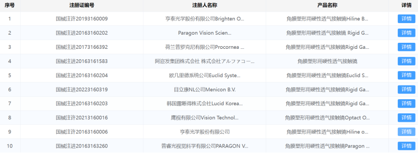 賽柏藍器械從國家藥監局官網查詢了解到,據不完全統計,目前國內共有15款角膜塑形鏡獲批,其中10款為進口。歐普康視、愛博醫療、天津視達佳、北京博視頓、浙江天瞳等5家企業擁有國產角膜塑形鏡注冊證,歐普康視、愛博醫療獲批較早,其余3家均為近兩年獲批。