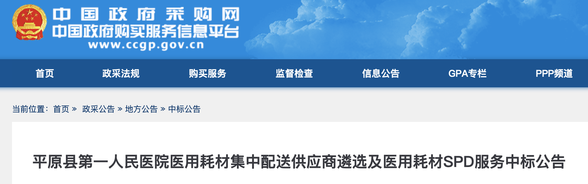 日前,據中國政府采購網披露,平原縣第一人民醫院醫用耗材集中配送供應商遴選及醫用耗材SPD服務中標公告出爐。