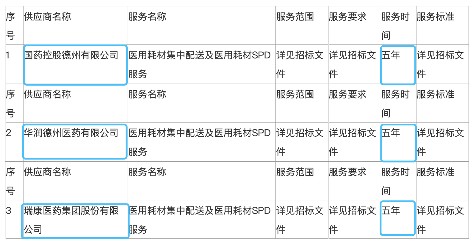 文件指出,平原縣第一人民醫院的年度耗材、試劑采購預算金額為4000萬元,服務周期為5年,總金額為2億。國藥控股德州有限公司、華潤德州醫藥有限公司、瑞康醫藥集團股份有限公司3家企業中標。