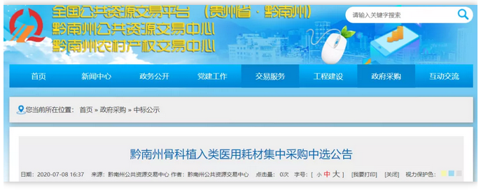 7月8日,貴州省黔南州公共資源交易中心發(fā)布《黔南州骨科植入類醫(yī)用耗材集中采購中選公告》,公布中選企業(yè)名單及價格降幅。