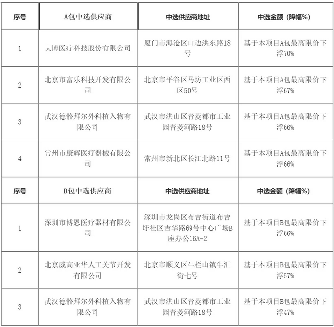 通過公開遴選、競標(biāo)、議價等環(huán)節(jié),最終4家企業(yè)入圍骨科植入(脊柱)類耗材供應(yīng)商,3家企業(yè)入圍骨科植入(關(guān)節(jié))類耗材供應(yīng)商,脊柱類耗材最高降幅70%,關(guān)節(jié)類耗材最高降幅66%。
