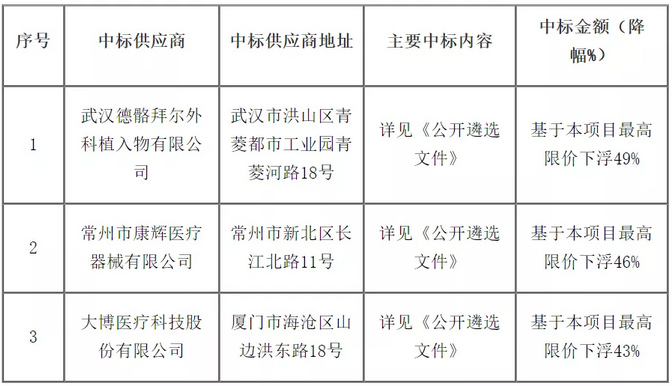 上述公告顯示,大博醫(yī)療、常州市康輝醫(yī)療、武漢德骼拜爾三家企業(yè)中標(biāo),中標(biāo)價格基于項(xiàng)目最高限價分別下降43%、46%和49%。