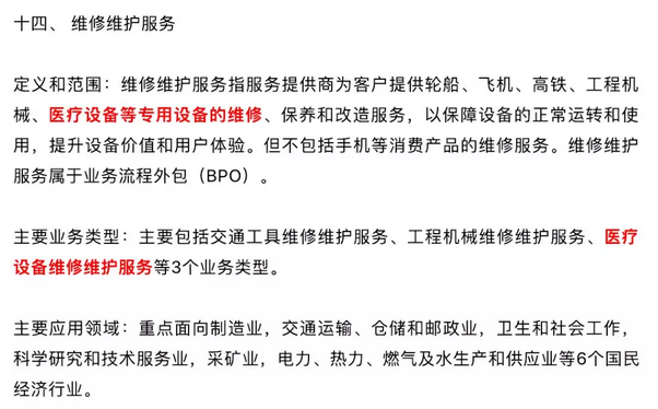 定義和范圍:維修維護(hù)服務(wù)指服務(wù)提供商為客戶提供輪船、飛機(jī)、高鐵、工程機(jī)械、醫(yī)療設(shè)備等專用設(shè)備的維修、保養(yǎng)和改造服務(wù),以保障設(shè)備的正常運(yùn)轉(zhuǎn)和使用,提升設(shè)備價值和用戶體驗。但不包括手機(jī)等消費(fèi)產(chǎn)品的維修服務(wù)。維修維護(hù)服務(wù)屬于業(yè)務(wù)流程外包(BPO)。