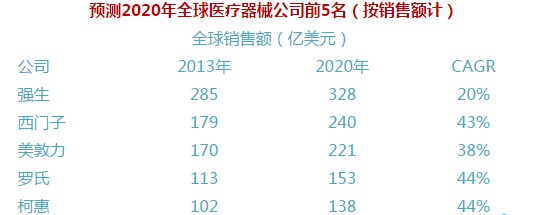 據預測:全球醫療器械公司到2020年競爭格局將會依照這樣的排名——強生居首,西門子、美敦力、羅氏、柯惠分列第二至第五位。