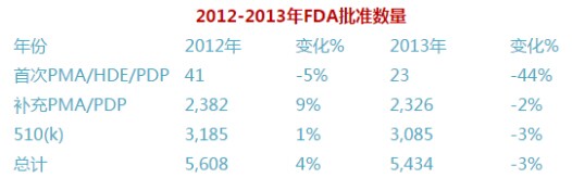 另一個變化是在監管方面,FDA希望能夠比之前批準更多的器械產品。FDA有很大的動力這么做:報告顯示,2013年FDA僅僅批準23個首次上市前審批(PMA),這個數字比前一年少了44%。
