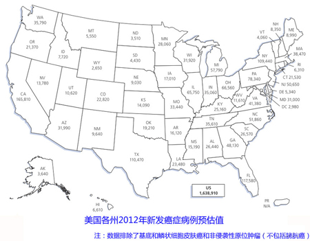 圖1:美國各州2012年新發(fā)癌癥病例預估值