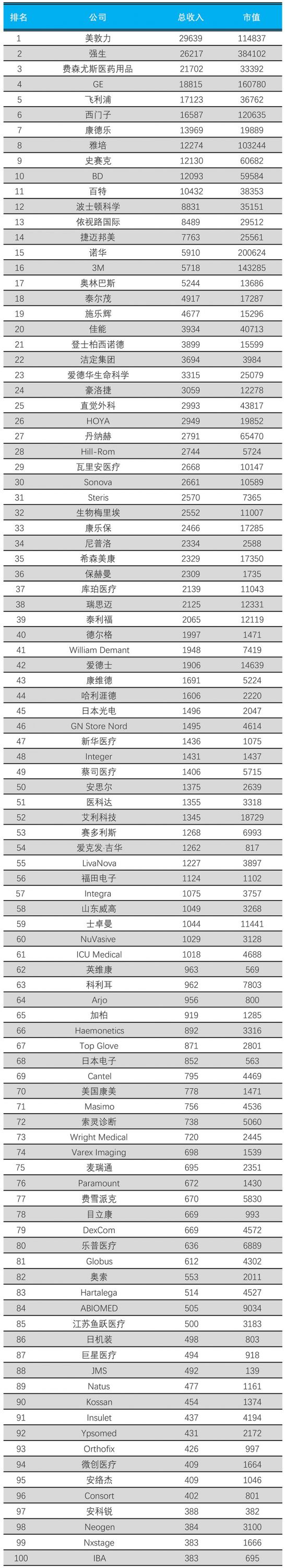 在這份百強榜中,國內有6家企業入選,分別是新華醫療(47)、山東威高醫用高分子制品(58)、北京樂普醫療(80)、江蘇魚躍醫療(85)、上海巨星醫療(87)、微創醫療(94)。